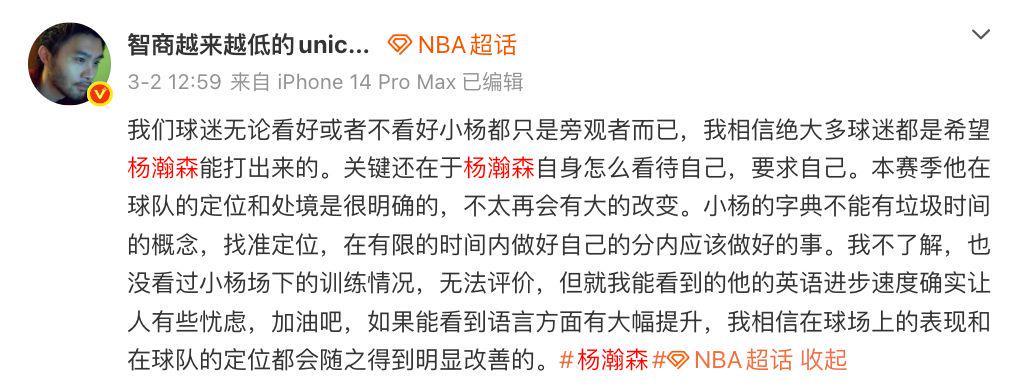 媒体人王健也更新社媒,谈到了杨瀚森的语言关,他表示:小杨的字典不能有垃圾时间的概念,找准定位,在有限的时间内做好自己的分内应该做好的事。我不了解,也没看过小杨场下的训练情况,无法评价,但就我能看到的他的英语进步速度确实让人有些忧虑,加油吧,如果能看到语言方面有大幅提升,我相信在球场上的表现和在球队的定位都会随之得到明显改善的。
