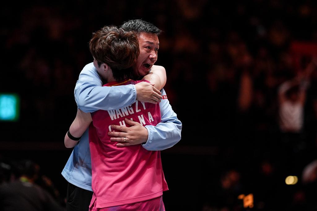王祉怡和教练罗毅刚拥抱。